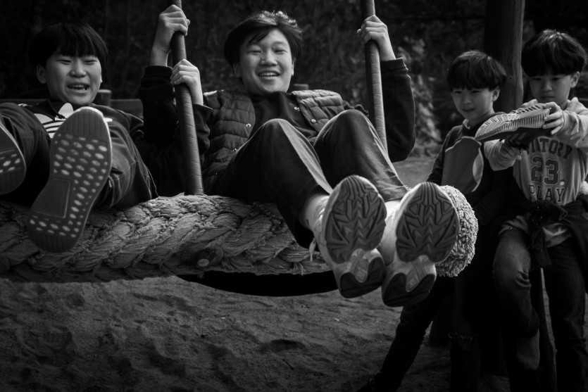 형 둘이 그네를 타는 동안 막내 둘은 야릇한 표정으로 순서를 기다리고 있다.