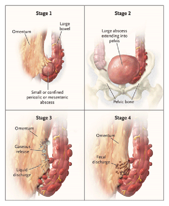 In general, abscesses in stage Ib and II may be drained by interventional radiology, and stage III and IV disease is managed with emergent surgery.