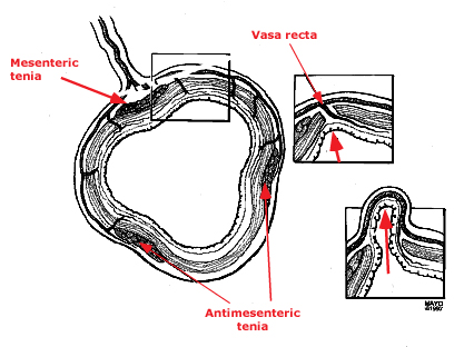 Diverticula develop at four well-defined points around the circumference of the colon, the sites at which the vasa recta penetrate the circular muscle layer. These vessels enter the wall on each side of the mesenteric taenia and on the mesenteric border of the two antimesenteric taeniae. The insets represent the development of a diverticulum at one such point of weakness.